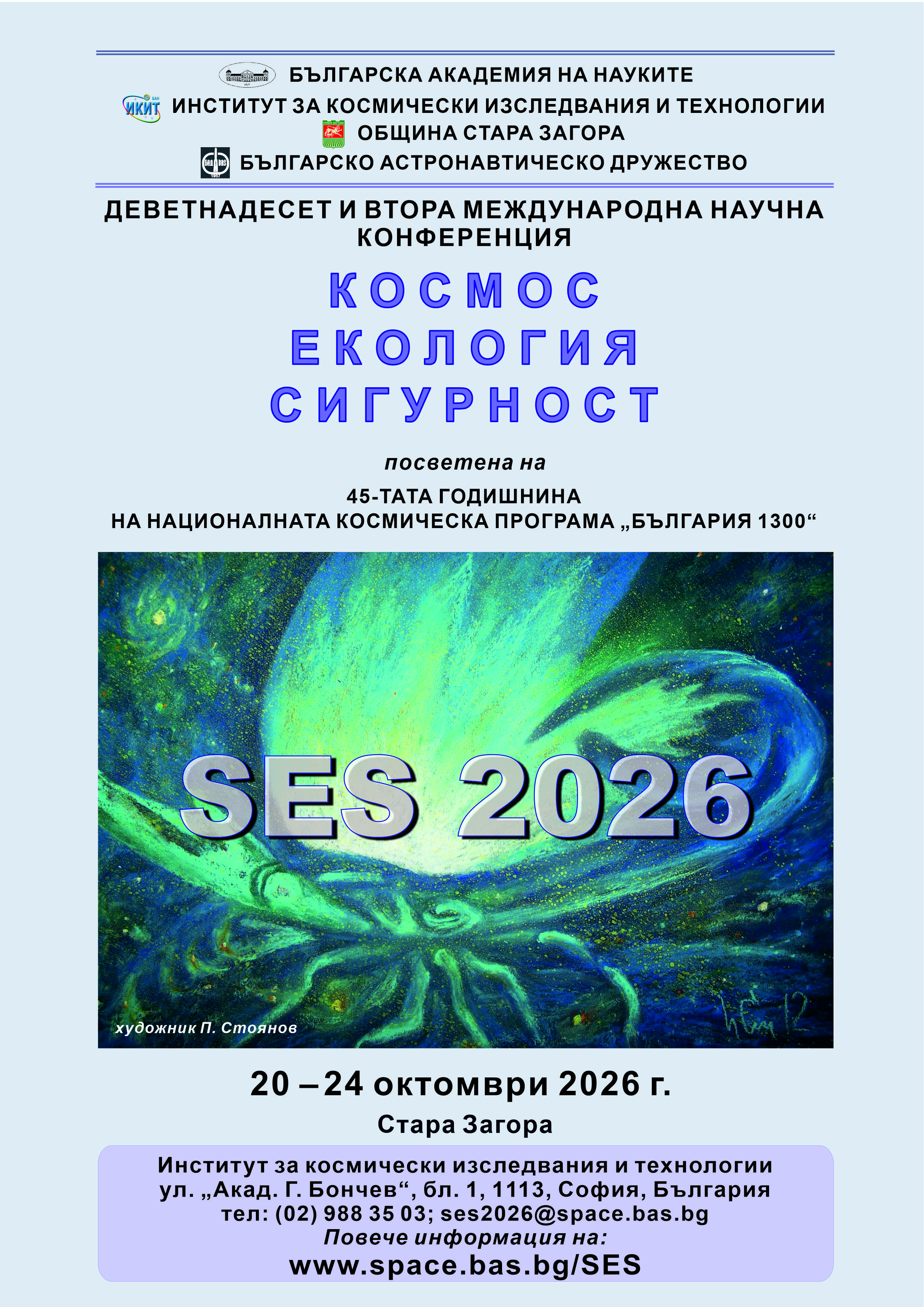 От 20 до 24 октомври 2026 г. ще се проведе поредната Двадесет и втора международна научна конференция Космос, Екология, Сигурност (Space, Ecology, Safety) – SES 2026 Посветена на 45-тата годишнина на националната космическа програма "БЪЛГАРИЯ 1300" Организатори: